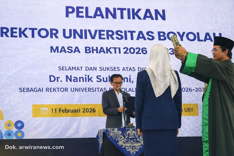 BOYOLALI(Jaringan Arwira Media Group)- Ketua Yayasan Bhinneka Karya, Indriyatmoko, SH, MM secara resmi melantik Rektor Universitas Boyolali (UBY) untuk masa jabatan 2026–2030, Rabu (11/2/2026) pagi. Prosesi pelantikan digelar di Grha Amarta, kompleks kampus setempat, disaksikan unsur yayasan, senat, dosen dan para tamu undangan.